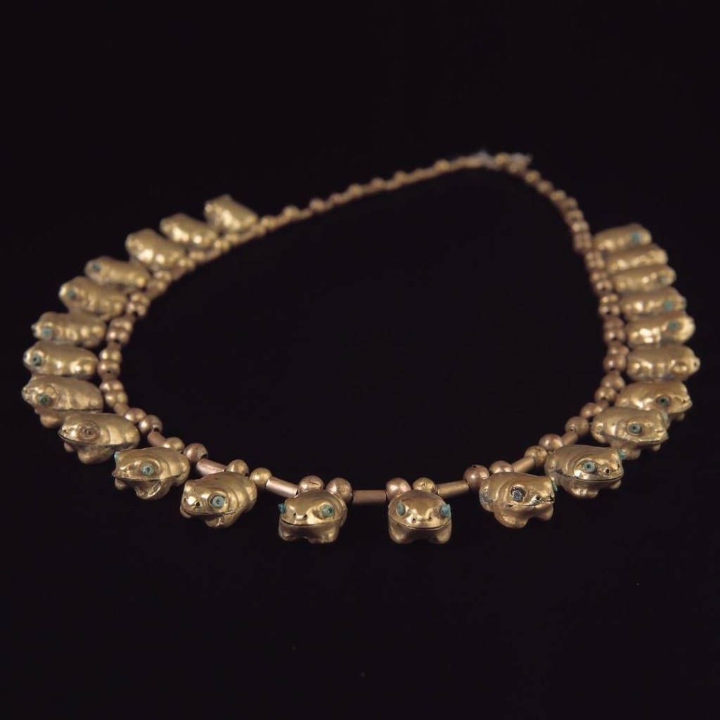 From Archeology & Art on Twitter, a necklace of gold and glass beads (for the toads’ eyes) from the Moche civilization of Peru. Unknown date except that the Moche clung to a narrow stretch of the Pacific coast in what is now northern Peru and for a brilliant six or so centuries existed from about AD 100 to 700, so this was made sometime in there. We can only guess at their demise. A thirty year super El Niño followed by a thirty year drought doubtless brought them to the brink, and then archeological evidence of civil war and—perhaps the final blow—attacks from the Huari civilization to the east (one of the succession of pre-Incan civilizations in the Peruvian highlands) seems to precede their final disappearance. Beyond the archeological evidence and supposition, though, little remains to us, such being the fate of non-literate civilizations. Instead all we can do is look at their extraordinary artwork, like these lovely little golden frogs, and wonder about the people who made them.